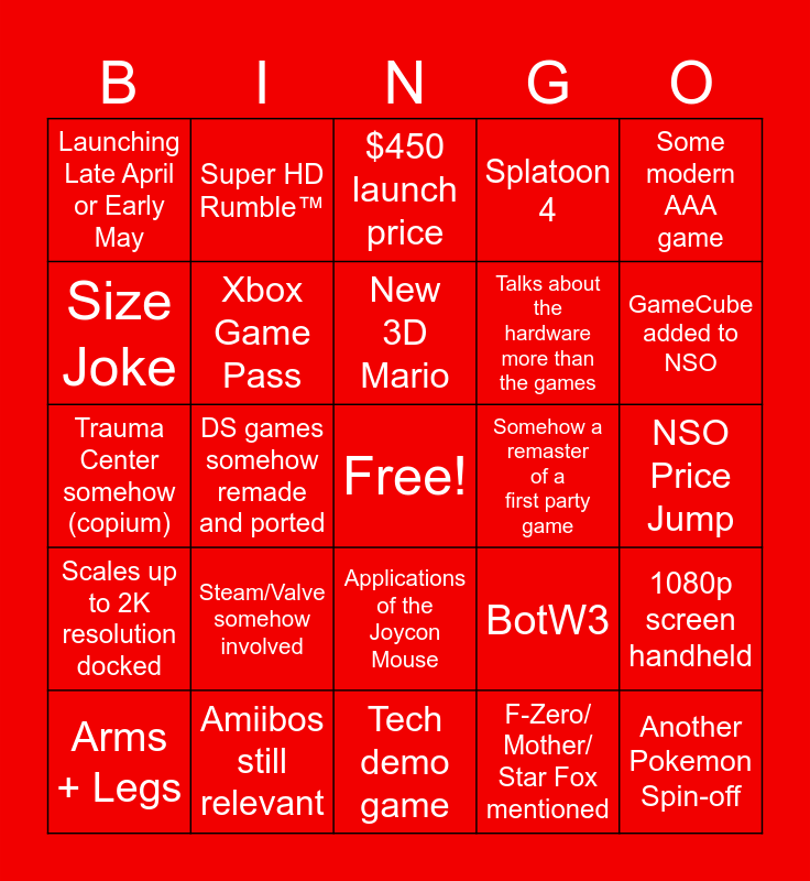 This bingo card has a free space and 24 words: Steam/Valve somehow involved, Amiibos still relevant, New 3D Mario, Arms + Legs, Some modern AAA game, Launching Late April or Early May, Size Joke, Super HD Rumble™, Somehow a remaster of a first party game, Applications of the Joycon Mouse, Talks about the hardware more than the games, Trauma Center somehow (copium), BotW3, 1080p screen handheld, Xbox Game Pass, F-Zero/ Mother/ Star Fox mentioned, NSO Price Jump, $450 launch price, GameCube added to NSO, DS games somehow remade and ported, Another Pokemon Spin-off, Scales up to 2K resolution docked, Splatoon 4 and Tech demo game.