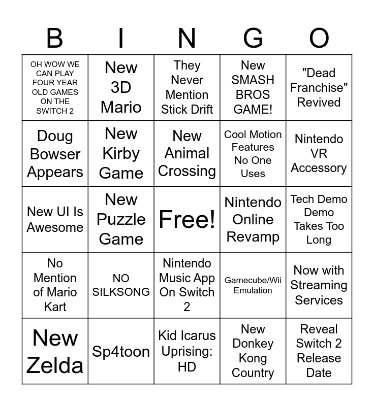 This bingo card has a free space and 24 words: NO SILKSONG, Sp4toon, New Animal Crossing, New Zelda, "Dead Franchise" Revived, OH WOW WE CAN PLAY FOUR YEAR OLD GAMES ON THE SWITCH 2, Doug Bowser Appears, New 3D Mario, Nintendo Online Revamp, Nintendo Music App On Switch 2, Cool Motion Features No One Uses, New UI Is Awesome, Gamecube/Wii Emulation, Now with Streaming Services, New Kirby Game, New Donkey Kong Country, Tech Demo Demo Takes Too Long, They Never Mention Stick Drift, Nintendo VR Accessory, New Puzzle Game, Reveal Switch 2 Release Date, No Mention of Mario Kart, New SMASH BROS GAME! and Kid Icarus Uprising: HD.