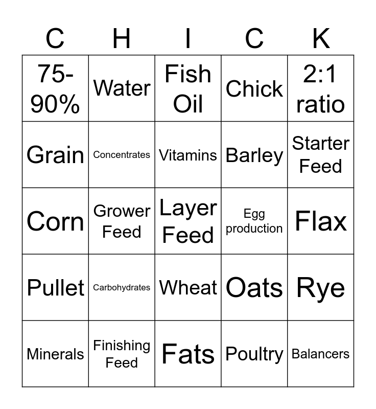 This bingo card has 25 words: Carbohydrates, Fats, Vitamins, Minerals, 2:1 ratio, 75-90%, Grain, Water, Egg production, Wheat, Barley, Corn, Oats, Rye, Concentrates, Balancers, Flax, Fish Oil, Starter Feed, Grower Feed, Layer Feed, Finishing Feed, Pullet, Chick and Poultry.