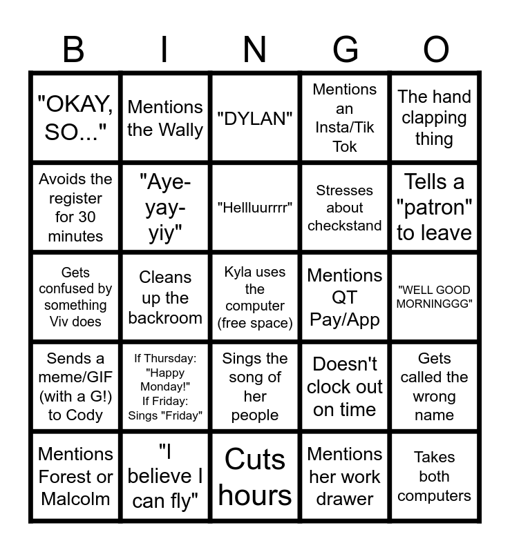 This bingo card has a free space and 24 words: If Thursday: "Happy Monday!" If Friday: Sings "Friday", "I believe I can fly", "Hellluurrrr", Mentions Forest or Malcolm, The hand clapping thing, "OKAY, SO...", Avoids the register for 30 minutes, Mentions the Wally, Mentions QT Pay/App, Sings the song of her people, Stresses about checkstand, Gets confused by something Viv does, Doesn't clock out on time, Gets called the wrong name, "Aye-yay-yiy", Mentions her work drawer, "WELL GOOD MORNINGGG", "DYLAN", Tells a "patron" to leave, Cleans up the backroom, Takes both computers, Sends a meme/GIF (with a G!) to Cody, Mentions an Insta/Tik Tok and Cuts hours.