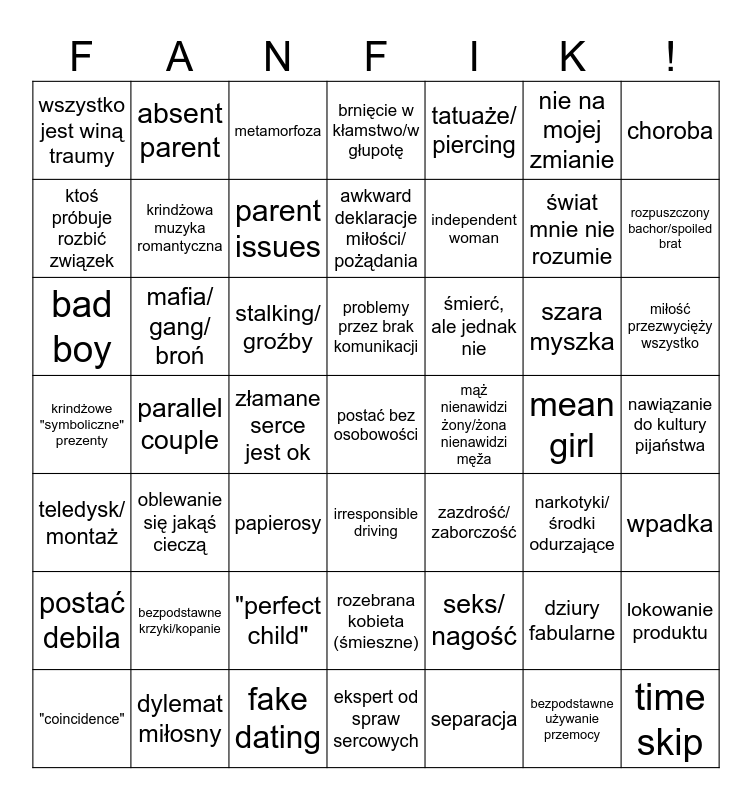 This bingo card has a free space and 48 words: seks/ nagość, świat mnie nie rozumie, ekspert od spraw sercowych, parallel couple, stalking/ groźby, nawiązanie do kultury pijaństwa, absent parent, dylemat miłosny, nie na mojej zmianie, irresponsible driving, choroba, brnięcie w kłamstwo/w głupotę, szara myszka, śmierć, ale jednak nie, postać debila, mean girl, ktoś próbuje rozbić związek, rozpuszczony bachor/spoiled brat, dziury fabularne, tatuaże/ piercing, independent woman, złamane serce jest ok, wszystko jest winą traumy, krindżowa muzyka romantyczna, lokowanie produktu, parent issues, miłość przezwycięży wszystko, "coincidence", problemy przez brak komunikacji, mafia/ gang/ broń, bezpodstawne używanie przemocy, mąż nienawidzi żony/żona nienawidzi męža, wpadka, bezpodstawne krzyki/kopanie, krindżowe "symboliczne" prezenty, zazdrość/ zaborczość, narkotyki/środki odurzające, bad boy, papierosy, "perfect child", teledysk/ montaż, time skip, metamorfoza, fake dating, awkward deklaracje miłości/ pożądania, rozebrana kobieta (śmieszne), oblewanie się jakąś cieczą and separacja.
