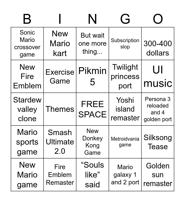 This bingo card has a free space and 24 words: Smash Ultimate 2.0, Fire Emblem Remaster, Pikmin 5, New Mario game, 300-400 dollars, Sonic Mario crossover game, New Fire Emblem, New Mario kart, Yoshi island remaster, New Donkey Kong Game, Twilight princess port, Stardew valley clone, Metroidvania game, Silksong Tease, Exercise Game, Mario galaxy 1 and 2 port, Persona 3 reloaded and 4 golden port, But wait one more thing..., UI music, Themes, Golden sun remaster, Mario sports game, Subscription slop and “Souls like” said.