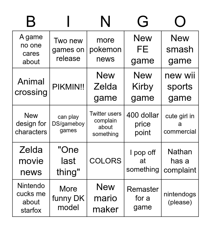 This bingo card has a free space and 24 words: "One last thing", More funny DK model, New Zelda game, Nintendo cucks me about starfox, New smash game, A game no one cares about, Animal crossing, Two new games on release, 400 dollar price point, COLORS, New Kirby game, New design for characters, I pop off at something, Nathan has a complaint, PIKMIN!!, Remaster for a game, cute girl in a commercial, more pokemon news, new wii sports game, can play DS/gameboy games, nintendogs (please), Zelda movie news, New FE game and New mario maker.