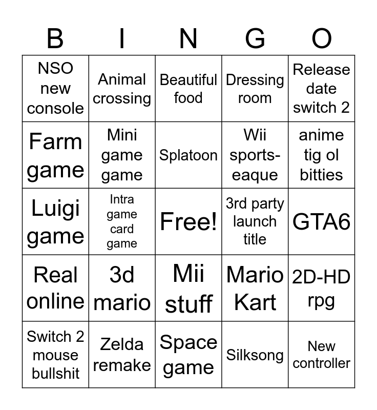 This bingo card has a free space and 24 words: 3d mario, Zelda remake, Splatoon, Switch 2 mouse bullshit, Release date switch 2, NSO new console, Farm game, Animal crossing, 3rd party launch title, Mii stuff, Wii sports-eaque, Luigi game, Mario Kart, 2D-HD rpg, Mini game game, Silksong, GTA6, Beautiful food, anime tig ol bitties, Intra game card game, New controller, Real online, Dressing room and Space game.