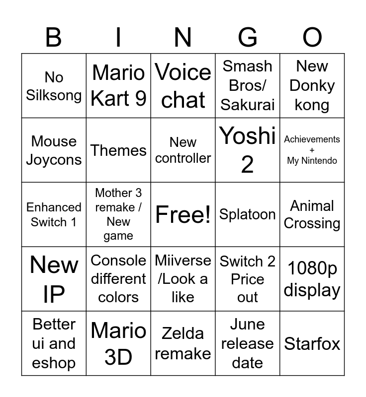 This bingo card has a free space and 24 words: Console different colors, Mario 3D, New controller, Better ui and eshop, New Donky kong, No Silksong, Mouse Joycons, Mario Kart 9, Splatoon, Miiverse /Look a like, Yoshi 2, Enhanced Switch 1, Switch 2 Price out, 1080p display, Themes, June release date, Animal Crossing, Voice chat, Achievements + My Nintendo, Mother 3 remake / New game, Starfox, New IP, Smash Bros/ Sakurai and Zelda remake.