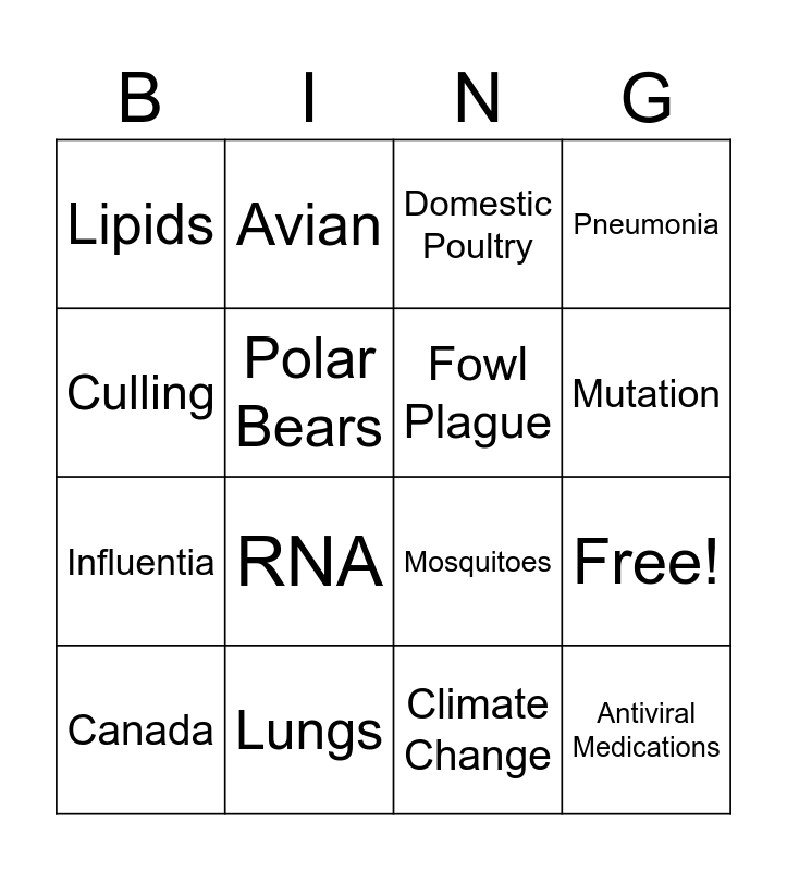 This bingo card has 20 words: Free!, Wild Birds, Domestic Poultry, U.S., Canada, Culling, Lungs, Lipids, Influentia, Avian, RNA, Mosquitoes, Polar Bears, Antiviral Medications, Fowl Plague, Glycoproteins, Mutation, Pneumonia, Climate Change and Type A.