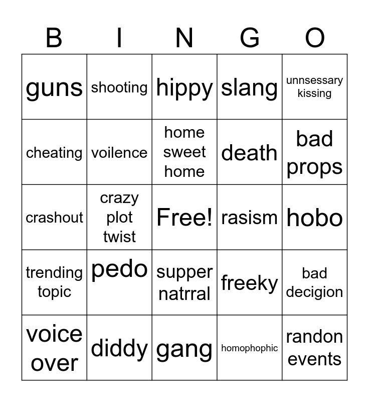 This bingo card has a free space and 24 words: pedo, diddy, home sweet home, voice over, unnsessary kissing, guns, cheating, shooting, rasism, supper natrral, death, crashout, freeky, bad decigion, voilence, homophophic, hobo, hippy, bad props, crazy plot twist, randon events, trending topic, slang and gang.