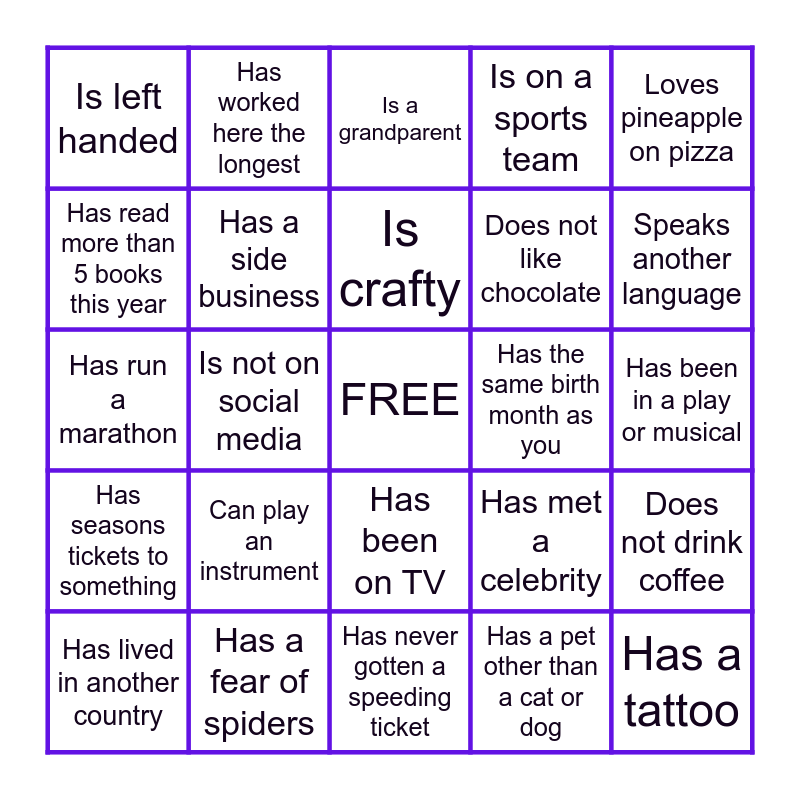 This bingo card has a free space and 24 words: Can play an instrument, Has a fear of spiders, Is crafty, Has lived in another country, Loves pineapple on pizza, Is left handed, Has read more than 5 books this year, Has worked here the longest, Has the same birth month as you, Has been on TV, Does not like chocolate, Has run a marathon, Has met a celebrity, Does not drink coffee, Has a side business, Has a pet other than a cat or dog, Has been in a play or musical, Is a grandparent, Speaks another language, Is not on social media, Has a tattoo, Has seasons tickets to something, Is on a sports team and Has never gotten a speeding ticket.