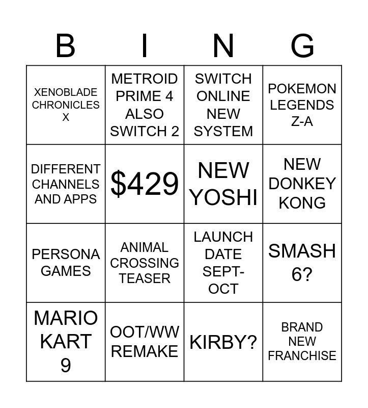 This bingo card has 16 words: OOT/WW REMAKE, SMASH 6?, SWITCH ONLINE NEW SYSTEM, XENOBLADE CHRONICLES X, PERSONA GAMES, METROID PRIME 4 ALSO SWITCH 2, LAUNCH DATE SEPT-OCT, KIRBY?, DIFFERENT CHANNELS AND APPS, $429, MARIO KART 9, POKEMON LEGENDS Z-A, ANIMAL CROSSING TEASER, NEW DONKEY KONG, NEW YOSHI and BRAND NEW FRANCHISE.
