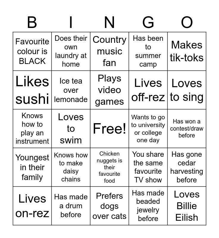 This bingo card has a free space and 39 words: Has been in the Youth Ambassador Program before, Favourite colour is RED, Prefers cats over dogs, Ice tea over lemonade, Lives on-rez, Chicken nuggets is their favourite food, Plays video games, Participated in Ceremony, Makes tik-toks, Youngest in their family, Loves to swim, Has been to summer camp, Loves Billie Eilish, Has won a contest/draw before, Wants to go to university or college one day, Knows how to make daisy chains, Can tell you one interesting animal/nature fact, Favourite colour is BLACK, First time in Youth Ambassadors, You share the same favourite TV show, Likes sushi, Prefers dogs over cats, Lives off-rez, Loves to sing, Has travelled to another country, Watched Moana 2, Wears size 7 shoes, Has made a meal for someone before, Has taken the seabus before, Does their own laundry at home, Kendrick over Drake, Knows how to FLOSS (teeth or dance), Country music fan, Has made a drum before, Has made beaded jewelry before, Made something out of cedar, Has gone cedar harvesting before, Knows how to play an instrument and Knows at least 5 Squamish words.