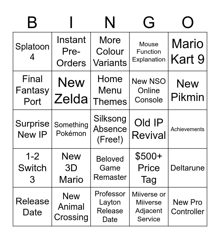 This bingo card has a free space and 24 words: New 3D Mario, New Animal Crossing, Home Menu Themes, Release Date, Mario Kart 9, Splatoon 4, Final Fantasy Port, Instant Pre-Orders, Old IP Revival, Beloved Game Remaster, New NSO Online Console, Surprise New IP, $500+ Price Tag, Deltarune, New Zelda, Miiverse or Miiverse Adjacent Service, Achievements, More Colour Variants, New Pikmin, Something Pokémon, New Pro Controller, 1-2 Switch 3, Mouse Function Explanation and Professor Layton Release Date.
