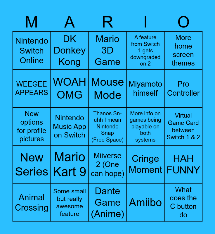 This bingo card has a free space and 24 words: Mario Kart 9, Some small but really awesome feature, Mouse Mode, Animal Crossing, More home screen themes, Nintendo Switch Online, WEEGEE APPEARS, DK Donkey Kong, More info on games being playable on both systems, Miiverse 2 (One can hope), Miyamoto himself, New options for profile pictures, Cringe Moment, HAH FUNNY, WOAH OMG, Amiibo, Virtual Game Card between Switch 1 & 2, Mario 3D Game, Pro Controller, Nintendo Music App on Switch, What does the C button do, New Series, A feature from Switch 1 gets downgraded on 2 and Dante Game (Anime).