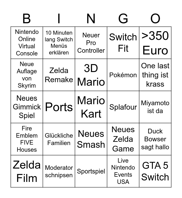 This bingo card has a free space and 24 words: Glückliche Familien, Moderator schnipsen, 3D Mario, Zelda Film, >350 Euro, Nintendo Online Virtual Console, Neue Auflage von Skyrim, 10 Minuten lang Switch Menüs erklären, Splafour, Neues Smash, Pokémon, Neues Gimmick Spiel, Neues Zelda Game, Duck Bowser sagt hallo, Zelda Remake, Live Nintendo Events USA, Miyamoto ist da, Neuer Pro Controller, One last thing ist krass, Ports, GTA 5 Switch, Fire Emblem FIVE Houses, Switch Fit and Sportspiel.