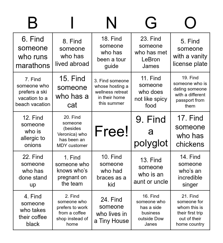 This bingo card has a free space and 24 words: 1. Find someone who knows who’s pregnant on the team, 2. Find someone who prefers to work from a coffee shop instead of home, 3. Find someone whose hosting a wellness retreat in their home this summer, 4. Find someone who takes their coffee black, 5. Find someone with a vanity license plate, 6. Find someone who runs marathons, 7. Find someone who prefers a ski vacation to a beach vacation, 8. Find someone who has lived abroad, 9. Find a polyglot, 10. Find someone who had braces as a kid, 11. Find someone who does not like spicy food, 12. Find someone who is allergic to onions, 13. Find someone who is an aunt or uncle, 14. Find someone who’s an incredible singer, 15. Find someone who has a cat, 16. Find someone who has a side business outside Dow Janes, 17. Find someone who has chickens, 18. Find someone who has been a tour guide, 19. Find someone who is dating someone with a different passport from them, 20. Find someone (besides Veronica) who has been an MDY customer, 21. Find someone for whom this is their first trip out of their home country, 22. Find someone who has done stand up, 23. Find someone who has met LeBron James and 24. Find someone who lives in a Tiny House.
