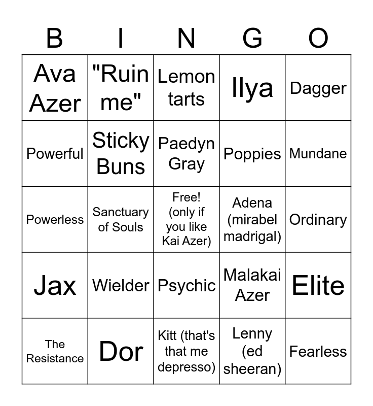 This bingo card has a free space and 27 words: Malakai Azer, Reckless, Poppies, Kitt (that's that me depresso), Powerful, Lemon tarts, "Ruin me", Jax, Adena (mirabel madrigal), Elite, Powerless, Ilya, The Resistance, Dor, Mundane, Loot, Sticky Buns, Paedyn Gray, Wielder, Ava Azer, Ordinary, Lenny (ed sheeran), Sanctuary of Souls, Fearless, Psychic, Dagger and Blair (ew).