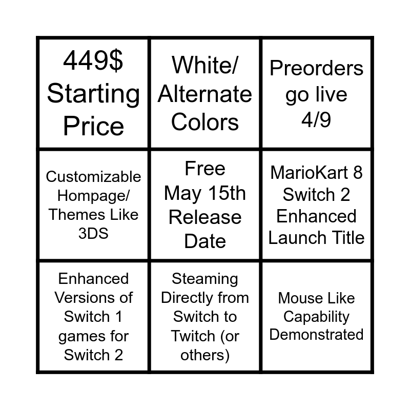 This bingo card has a free space and 8 words: MarioKart 8 Switch 2 Enhanced Launch Title, Preorders go live 4/9, White/ Alternate Colors, Enhanced Versions of Switch 1 games for Switch 2, 449$ Starting Price, Mouse Like Capability Demonstrated, Customizable Hompage/ Themes Like 3DS and Steaming Directly from Switch to Twitch (or others).