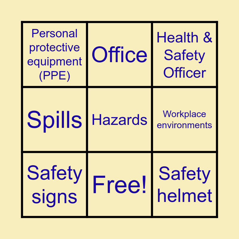 This bingo card has 15 words: Slips, trips, and falls, Risk Assessment, Health & Safety Officer, Personal protective equipment (PPE), Free!, Hazards, Accidents, Reducing Risk, Workplace environments, Safety helmet, Gloves, Spills, Safety signs, Office and Responsibility.