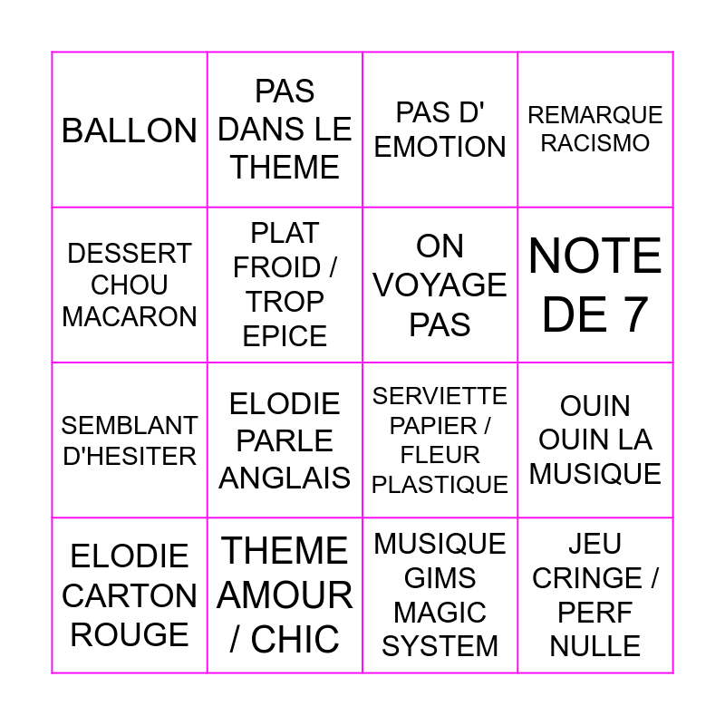 This bingo card has 16 words: THEME AMOUR / CHIC, OUIN OUIN LA MUSIQUE, PAS D' EMOTION, BALLON, SEMBLANT D'HESITER, PAS DANS LE THEME, SERVIETTE PAPIER / FLEUR PLASTIQUE, MUSIQUE GIMS MAGIC SYSTEM, DESSERT CHOU MACARON, PLAT FROID / TROP EPICE, ELODIE CARTON ROUGE, REMARQUE RACISMO, ELODIE PARLE ANGLAIS, NOTE DE 7, ON VOYAGE PAS and JEU CRINGE / PERF NULLE.