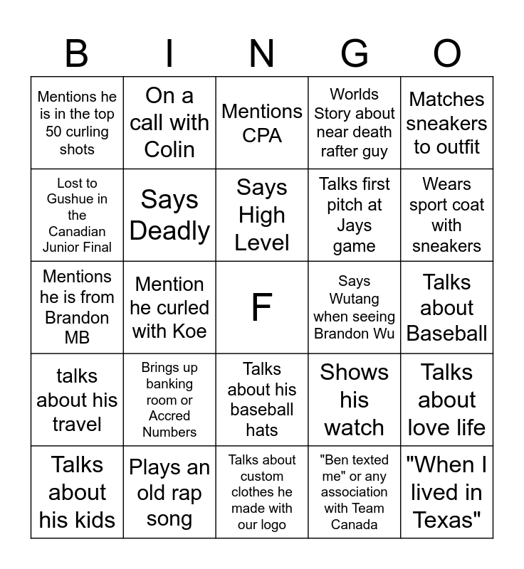 This bingo card has a free space and 29 words: Mentions he won Brier or Worlds, Plays an old rap song, Mentions CPA, Shows a excel sheet, Matches sneakers to outfit, Mentions he is in the top 50 curling shots, Says Deadly, Says High Level, Says Wutang when seeing Brandon Wu, Talks about love life, Talks about his kids, Mention he curled with Koe, "Ben texted me" or any association with Team Canada, "When I lived in Texas", Mentions he is from Brandon MB, Drinks a glass of red wine or old fashion, Talks about custom clothes he made with our logo, Shows his watch, Wears sport coat with sneakers, talks about his travel, Brings up banking room or Accred Numbers, Receives a free item from Goldline, Talks first pitch at Jays game, Talks about Baseball, Lost to Gushue in the Canadian Junior Final, On a call with Colin, Talks about his baseball hats, Worlds Story about near death rafter guy and "When we won in Cortina...".