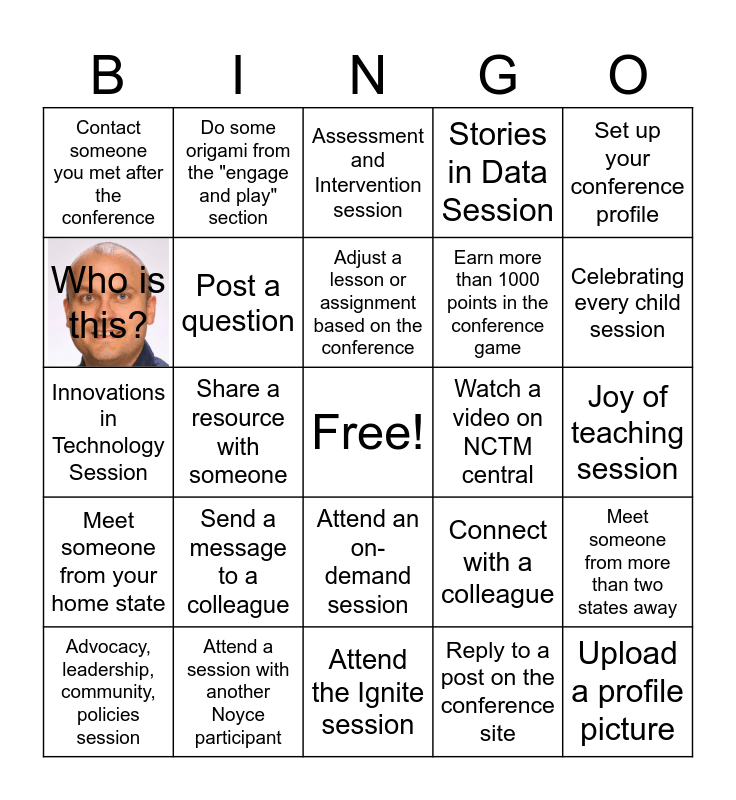 This bingo card has 2 images, a free space and 29 words: Advocacy, leadership, community, policies session, Attend a live session, Share a resource with someone, Find this image on the site, Contact someone you met after the conference, Assessment and Intervention session, Post a question, Send a message to a colleague, Watch a video on NCTM central, Attend a session with another Noyce participant, Joy of teaching session, Upload a profile picture, Attend the Ignite session, Reply to a post on the conference site, Celebrating every child session, Attend a Roundtable discussion, Attend an on-demand session, Meet someone from your home state, Set up your conference profile, Innovations in Technology Session, Connect with a colleague, Set a goal for your teaching based on a session, Earn more than 1000 points in the conference game, Who is this?, Stories in Data Session, Do some origami from the "engage and play" section, Meet someone from more than two states away, Adjust a lesson or assignment based on the conference and Share something you learned with someone not at the conference.