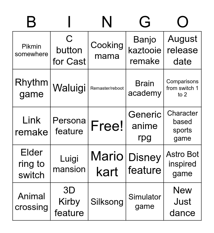 This bingo card has a free space and 24 words: Luigi mansion, 3D Kirby feature, Remaster/reboot, Animal crossing, August release date, Pikmin somewhere, Rhythm game, C button for Cast, Generic anime rpg, Mario kart, Brain academy, Link remake, Disney feature, Astro Bot inspired game, Waluigi, Simulator game, Character based sports game, Cooking mama, Comparisons from switch 1 to 2, Persona feature, New Just dance, Elder ring to switch, Banjo kaztooie remake and Silksong.