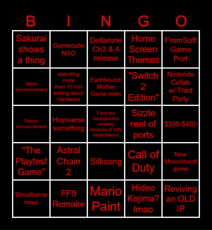 This bingo card has a free space and 24 words: Astral Chain 2, FF9 Remake, Earthbound/ Mother Game news, Bloodborne lmao, FromSoft Game Port, Sakurai shows a thing, Zelda announcement, Gamecube NSO, Sizzle reel of ports, Silksong, "Switch 2 Edition", Pikmin Announcement, Call of Duty, New Monolithsoft game, spending more than 15 min talking about Hardware, Hideo Kojima? lmao, $399-$450, Deltarune Ch3 & 4 release, Nintendo Collab w/ Third Party, Hoyoverse something, Reviving an OLD IP, "The Playtest Game", Home Screen Themes and Mario Paint.