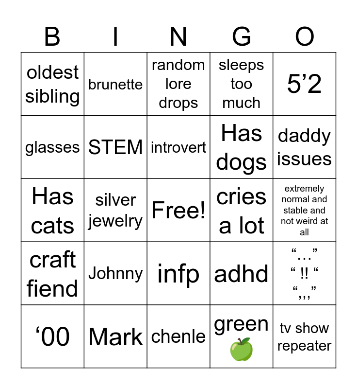 This bingo card has a free space and 24 words: Johnny, Mark, introvert, ‘00, 5’2, oldest sibling, glasses, brunette, cries a lot, infp, Has dogs, Has cats, adhd, “…” “ !! “ “,,,”, STEM, green 🍏, extremely normal and stable and not weird at all, random lore drops, daddy issues, silver jewelry, tv show repeater, craft fiend, sleeps too much and chenle.
