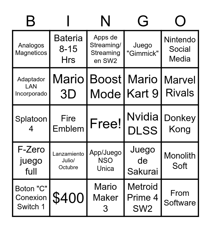 This bingo card has a free space and 24 words: Lanzamiento Julio/ Octubre, $400, Boost Mode, Boton "C" Conexion Switch 1, Nintendo Social Media, Analogos Magneticos, Adaptador LAN Incorporado, Bateria 8-15 Hrs, Nvidia DLSS, App/Juego NSO Unica, Mario Kart 9, Splatoon 4, Juego de Sakurai, Monolith Soft, Mario 3D, Metroid Prime 4 SW2, Donkey Kong, Apps de Streaming/ Streaming en SW2, Marvel Rivals, Fire Emblem, From Software, F-Zero juego full, Juego "Gimmick" and Mario Maker 3.