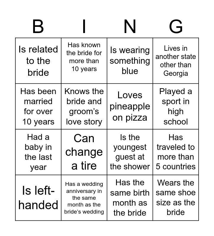 This bingo card has 16 words: Has a wedding anniversary in the same month as the bride’s wedding, Has traveled to more than 5 countries, Is wearing something blue, Is related to the bride, Had a baby in the last year, Has known the bride for more than 10 years, Is the youngest guest at the shower, Has the same birth month as the bride, Has been married for over 10 years, Knows the bride and groom’s love story, Is left-handed, Lives in another state other than Georgia, Can change a tire, Played a sport in high school, Loves pineapple on pizza and Wears the same shoe size as the bride.