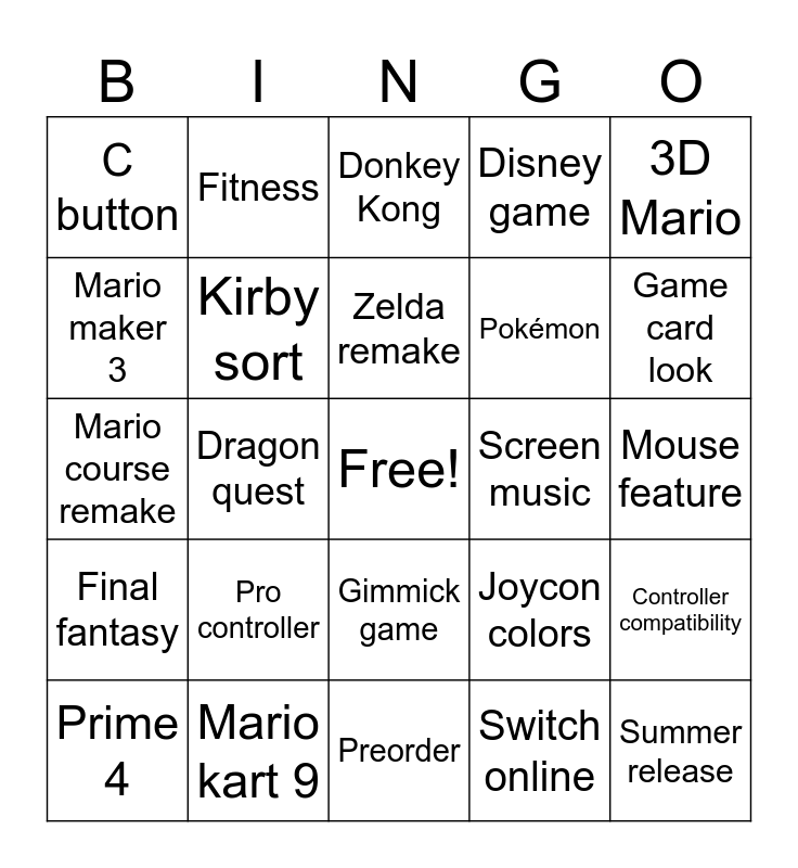 This bingo card has a free space and 24 words: Pro controller, Mario kart 9, Zelda remake, Prime 4, 3D Mario, C button, Mario maker 3, Fitness, Screen music, Gimmick game, Pokémon, Mario course remake, Joycon colors, Controller compatibility, Kirby sort, Switch online, Mouse feature, Donkey Kong, Game card look, Dragon quest, Summer release, Final fantasy, Disney game and Preorder.