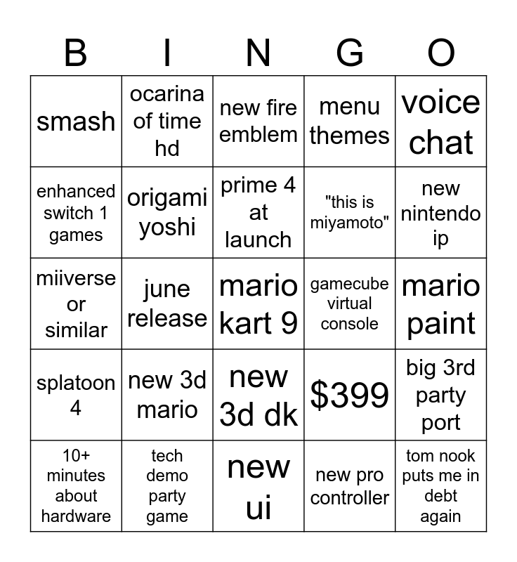 This bingo card has a free space and 24 words: new 3d mario, tech demo party game, prime 4 at launch, 10+ minutes about hardware, voice chat, smash, enhanced switch 1 games, ocarina of time hd, gamecube virtual console, new 3d dk, "this is miyamoto", miiverse or similar, $399, big 3rd party port, origami yoshi, new pro controller, mario paint, new fire emblem, new nintendo ip, june release, tom nook puts me in debt again, splatoon 4, menu themes and new ui.