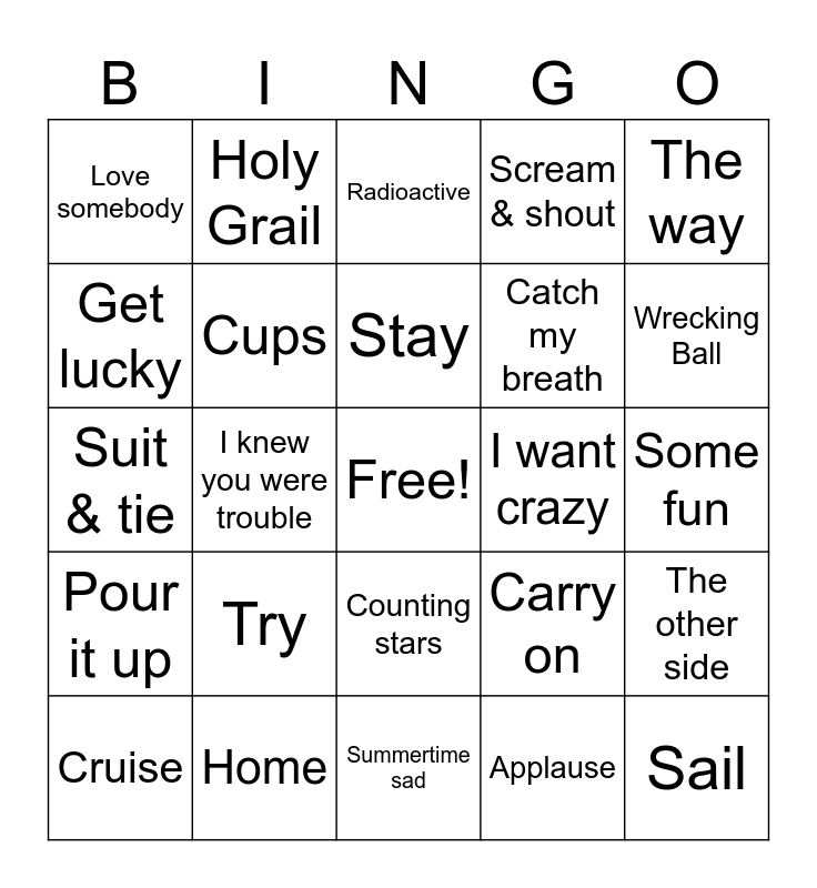 This bingo card has a free space and 74 words: Thrift shop, Blurred lines, Radioactive, Harlem Shake, Can’t hold us, Mirrors, Just give me a reason, When I was your man, Cruise, Roar, Locked out of heaven, Ho Hey, Stay, Get lucky, Royals, I knew you were trouble, We can’t stop, Wrecking Ball, Wake me up, Suit & tie, Cups, Holy Grail, Scream & shout, Clarity, Sail, Don’t you worry, child, Diamonds, I love it, Safe and sound, Treasure, The way, Come & get it, Hold on we’re going home, Daylight, Feel this moment, Applause, One more night, My songs know what you did in the dark, Beauty and a beast, Sweet nothing, Summertime sad, Home, It’s time, Girl on fire, Heart attack, Love somebody, I will wait, Try, Wagon wheel, Gangnam Style, I need your, Die Young, Some fun, Boys round here, Gone gone gone, Demons, Counting stars, I cry, Little talks, The other side, Catch my breath, Crash my party, Pour it up, 22, I want crazy, The fox, Best song ever, The A-Team, Carry on, Highway, don’t care, That’s my kind of night, Sure be cool if you did, Beautiful and Let me love you.