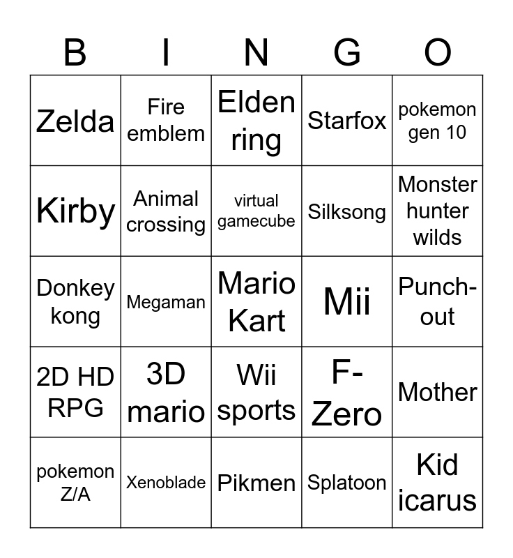 This bingo card has a free space and 24 words: 3D mario, Xenoblade, virtual gamecube, pokemon Z/A, pokemon gen 10, Zelda, Kirby, Fire emblem, Mii, Wii sports, Silksong, Donkey kong, F-Zero, Mother, Animal crossing, Splatoon, Punch-out, Elden ring, Monster hunter wilds, Megaman, Kid icarus, 2D HD RPG, Starfox and Pikmen.