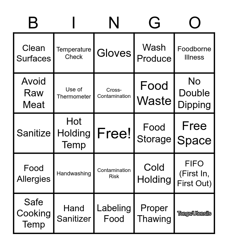 This bingo card has a free space and 24 words: Safe Cooking Temp, Handwashing, Cross-Contamination, Proper Thawing, Foodborne Illness, Clean Surfaces, Temperature Check, Gloves, Food Storage, Free Space, Sanitize, Use of Thermometer, Cold Holding, FIFO (First In, First Out), Avoid Raw Meat, Hand Sanitizer, Labeling Food, Wash Produce, No Double Dipping, Food Allergies, Hot Holding Temp, Contamination Risk, Food Waste and Tongs/Utensils.