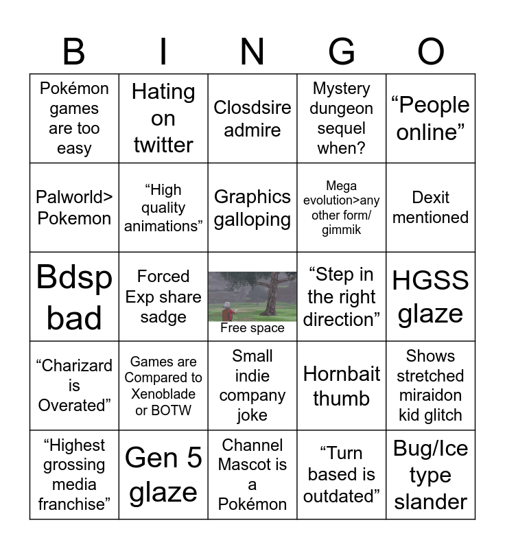 This bingo card has a free space and 24 words: Games are Compared to Xenoblade or BOTW, Gen 5 glaze, Graphics galloping, “Highest grossing media franchise”, “People online”, Pokémon games are too easy, Palworld> Pokemon, Hating on twitter, “Step in the right direction”, Small indie company joke, Mega evolution>any other form/ gimmik, Bdsp bad, Hornbait thumb, Shows stretched miraidon kid glitch, “High quality animations”, “Turn based is outdated”, HGSS glaze, Closdsire admire, Dexit mentioned, Forced Exp share sadge, Bug/Ice type slander, “Charizard is Overated”, Mystery dungeon sequel when? and Channel Mascot is a Pokémon.