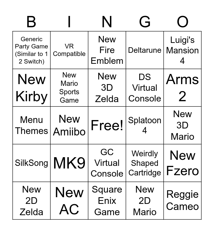 This bingo card has a free space and 24 words: MK9, New AC, New 3D Zelda, New 2D Zelda, Luigi's Mansion 4, Generic Party Game (Similar to 1 2 Switch), New Kirby, VR Compatible, Splatoon 4, GC Virtual Console, DS Virtual Console, Menu Themes, Weirdly Shaped Cartridge, New Fzero, New Mario Sports Game, New 2D Mario, New 3D Mario, New Fire Emblem, Arms 2, New Amiibo, Reggie Cameo, SilkSong, Deltarune and Square Enix Game.