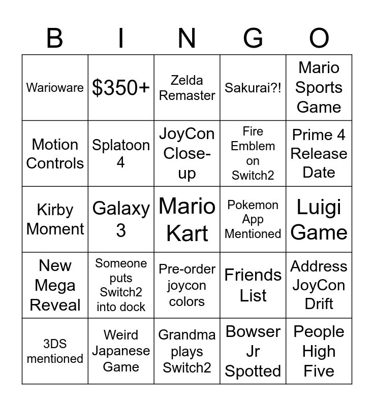 This bingo card has a free space and 24 words: Someone puts Switch2 into dock, Weird Japanese Game, JoyCon Close-up, 3DS mentioned, Mario Sports Game, Warioware, Motion Controls, $350+, Pokemon App Mentioned, Pre-order joycon colors, Fire Emblem on Switch2, Kirby Moment, Friends List, Address JoyCon Drift, Splatoon 4, Bowser Jr Spotted, Luigi Game, Zelda Remaster, Prime 4 Release Date, Galaxy 3, People High Five, New Mega Reveal, Sakurai?! and Grandma plays Switch2.