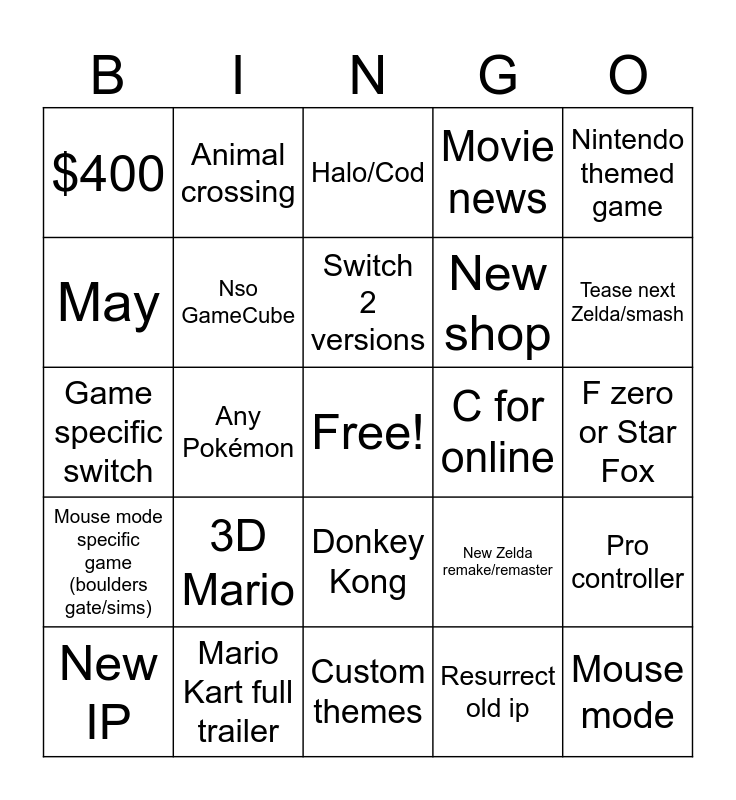 This bingo card has a free space and 24 words: 3D Mario, Mario Kart full trailer, Switch 2 versions, New IP, Nintendo themed game, $400, May, Animal crossing, C for online, Donkey Kong, New shop, Game specific switch, New Zelda remake/remaster, Pro controller, Nso GameCube, Resurrect old ip, F zero or Star Fox, Halo/Cod, Tease next Zelda/smash, Any Pokémon, Mouse mode, Mouse mode specific game (boulders gate/sims), Movie news and Custom themes.