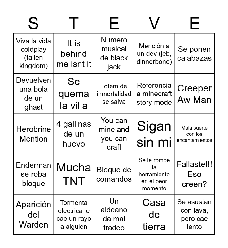 This bingo card has a free space and 24 words: Mucha TNT, Tormenta electrica le cae un rayo a alguien, Totem de inmortalidad se salva, Aparición del Warden, Se ponen calabazas, Viva la vida coldplay (fallen kingdom), Devuelven una bola de un ghast, It is behind me isnt it, Sigan sin mi, Bloque de comandos, Referencia a minecraft story mode, Herobrine Mention, Se le rompe la herramiento en el peor momento, Fallaste!!! Eso creen?, Se quema la villa, Casa de tierra, Mala suerte con los encantamientos, Numero musical de black jack, Creeper Aw Man, 4 gallinas de un huevo, Se asustan con lava, pero cae lento, Enderman se roba bloque, Mención a un dev (jeb, dinnerbone) and Un aldeano da mal tradeo.