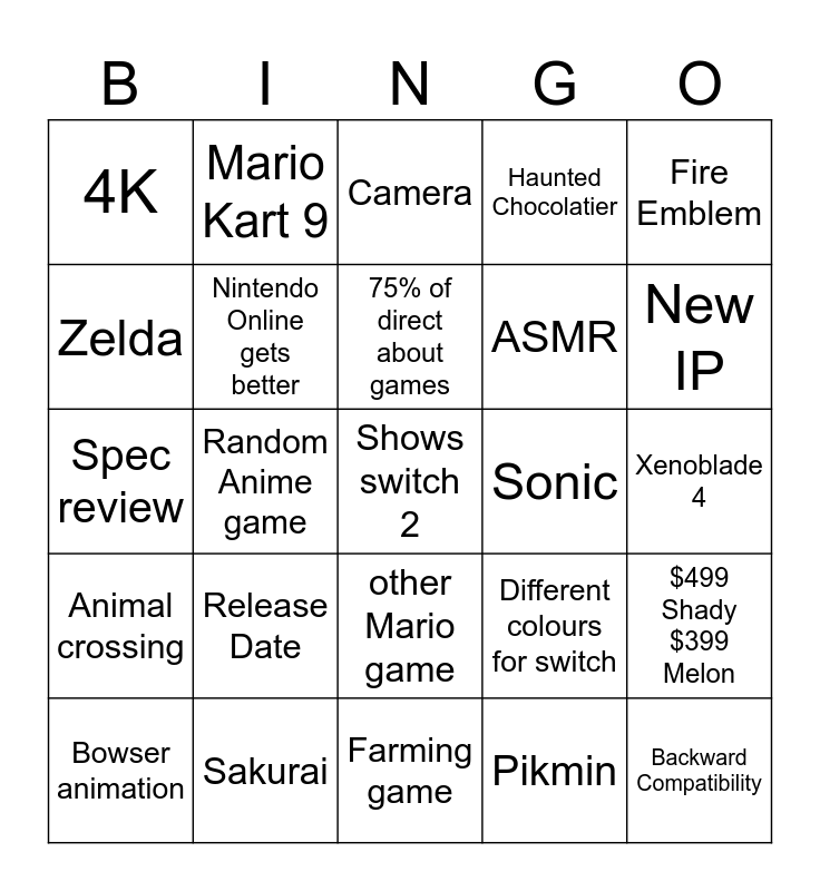 This bingo card has a free space and 24 words: Release Date, Sakurai, 75% of direct about games, Bowser animation, Fire Emblem, 4K, Zelda, Mario Kart 9, Sonic, other Mario game, ASMR, Spec review, Different colours for switch, $499 Shady $399 Melon, Nintendo Online gets better, Pikmin, Xenoblade 4, Camera, New IP, Random Anime game, Backward Compatibility, Animal crossing, Haunted Chocolatier and Farming game.