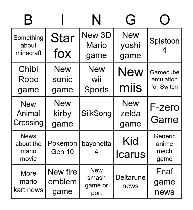 This bingo card has a free space and 24 words: Pokemon Gen 10, New fire emblem game, New wii Sports, More mario kart news, Splatoon 4, Something about minecraft, Chibi Robo game, Star fox, New zelda game, bayonetta 4, New miis, New Animal Crossing, Kid Icarus, Generic anime mech game, New sonic game, Deltarune news, F-zero Game, New 3D Mario game, Gamecube emulation for Switch, New kirby game, Fnaf game news, News about the mario movie, New yoshi game and New smash game or port.