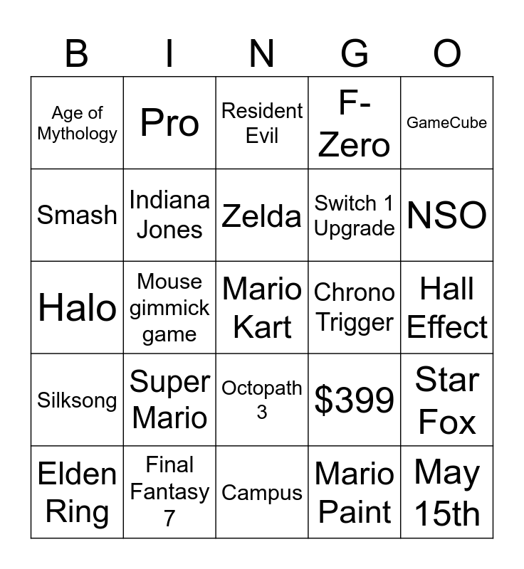 This bingo card has a free space and 24 words: Super Mario, Final Fantasy 7, Zelda, Elden Ring, GameCube, Age of Mythology, Smash, Pro, Chrono Trigger, Octopath 3, Switch 1 Upgrade, Halo, $399, Star Fox, Indiana Jones, Mario Paint, Hall Effect, Resident Evil, NSO, Mouse gimmick game, May 15th, Silksong, F-Zero and Campus.