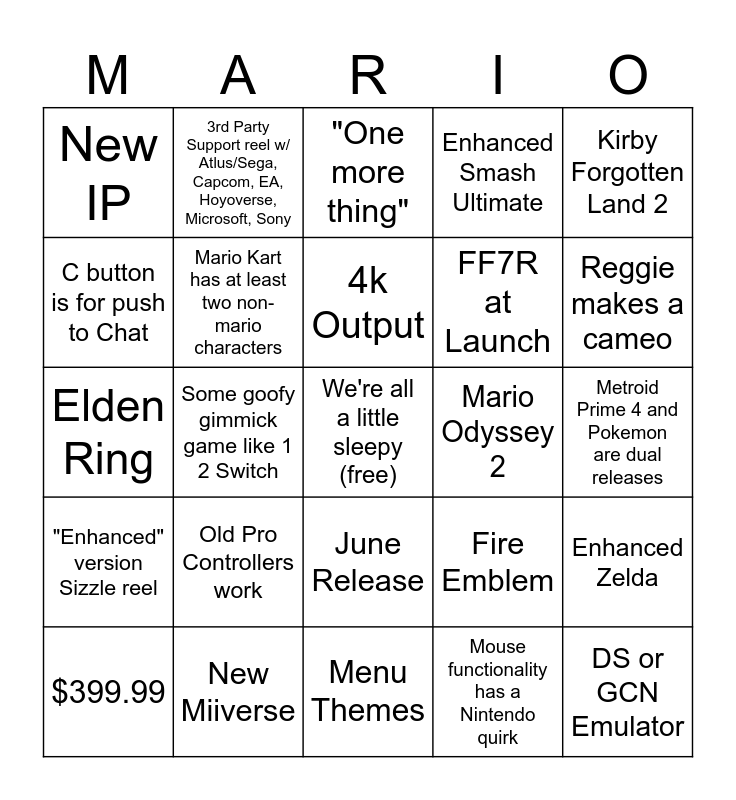 This bingo card has a free space and 24 words: $399.99, Old Pro Controllers work, 4k Output, Mouse functionality has a Nintendo quirk, Kirby Forgotten Land 2, New IP, 3rd Party Support reel w/ Atlus/Sega, Capcom, EA, Hoyoverse, Microsoft, Sony, "One more thing", Mario Odyssey 2, Metroid Prime 4 and Pokemon are dual releases, Elden Ring, Mario Kart has at least two non-mario characters, Fire Emblem, Enhanced Zelda, C button is for push to Chat, New Miiverse, Menu Themes, Enhanced Smash Ultimate, Reggie makes a cameo, "Enhanced" version Sizzle reel, Some goofy gimmick game like 1 2 Switch, June Release, FF7R at Launch and DS or GCN Emulator.