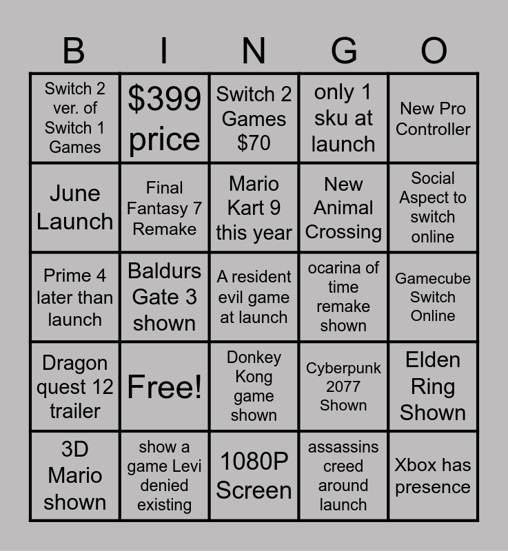 This bingo card has 25 words: Free!, 1080P Screen, Mario Kart 9 this year, 3D Mario shown, New Pro Controller, Switch 2 ver. of Switch 1 Games, June Launch, $399 price, ocarina of time remake shown, Donkey Kong game shown, New Animal Crossing, Prime 4 later than launch, Cyberpunk 2077 Shown, Elden Ring Shown, Final Fantasy 7 Remake, Xbox has presence, Gamecube Switch Online, Switch 2 Games $70, Social Aspect to switch online, Baldurs Gate 3 shown, A resident evil game at launch, show a game Levi denied existing, Dragon quest 12 trailer, only 1 sku at launch and assassins creed around launch.