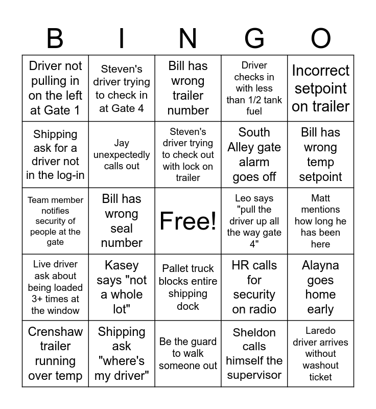 This bingo card has a free space and 24 words: Kasey says "not a whole lot", Shipping ask "where's my driver", Steven's driver trying to check out with lock on trailer, Crenshaw trailer running over temp, Incorrect setpoint on trailer, Driver not pulling in on the left at Gate 1, Shipping ask for a driver not in the log-in, Steven's driver trying to check in at Gate 4, Leo says "pull the driver up all the way gate 4", Pallet truck blocks entire shipping dock, South Alley gate alarm goes off, Team member notifies security of people at the gate, HR calls for security on radio, Alayna goes home early, Jay unexpectedly calls out, Sheldon calls himself the supervisor, Matt mentions how long he has been here, Bill has wrong trailer number, Bill has wrong temp setpoint, Bill has wrong seal number, Laredo driver arrives without washout ticket, Live driver ask about being loaded 3+ times at the window, Driver checks in with less than 1/2 tank fuel and Be the guard to walk someone out.