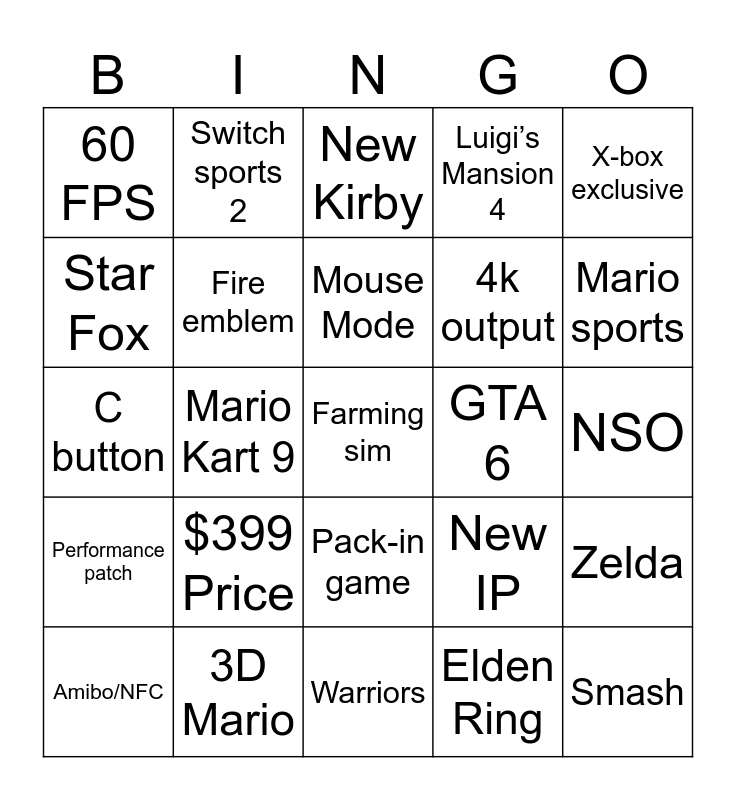 This bingo card has a free space and 24 words: $399 Price, 3D Mario, Mouse Mode, Amibo/NFC, X-box exclusive, 60 FPS, Star Fox, Switch sports 2, GTA 6, Pack-in game, 4k output, C button, New IP, Zelda, Fire emblem, Elden Ring, NSO, New Kirby, Mario sports, Mario Kart 9, Smash, Performance patch, Luigi’s Mansion 4 and Warriors.