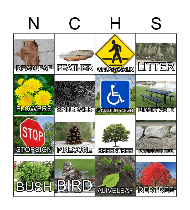 This bingo card has 16 images and 16 words: BIRD, ROCK/BOULDER, CROSSWALK, DEADLEAF, STOPSIGN, FEATHER, GREENTREE, ALIVELEAF, FLOWERS, SPIDERWEB, BUSH, LITTER, PINECONE, PICNICTABLE, DISABILITYSIGN and REDTREE.