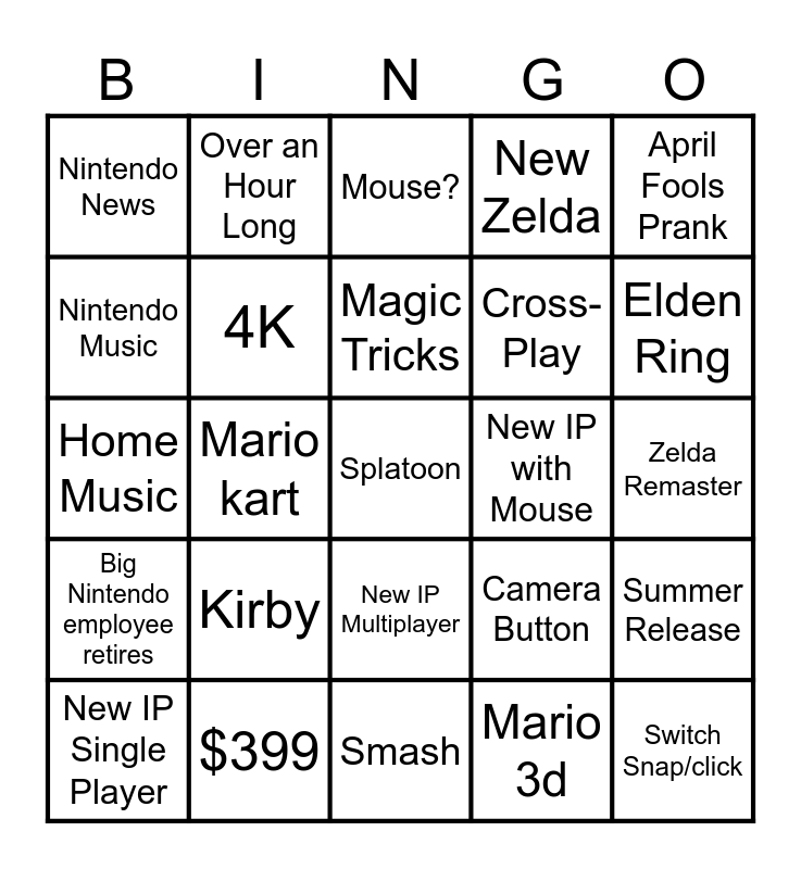 This bingo card has 25 words: Kirby, Smash, Magic Tricks, New IP Single Player, April Fools Prank, Nintendo News, Nintendo Music, Over an Hour Long, New IP with Mouse, New IP Multiplayer, Cross-Play, Home Music, Camera Button, Summer Release, 4K, Switch Snap/click, Zelda Remaster, Mouse?, Elden Ring, Mario kart, Splatoon, $399, Big Nintendo employee retires, New Zelda and Mario 3d.