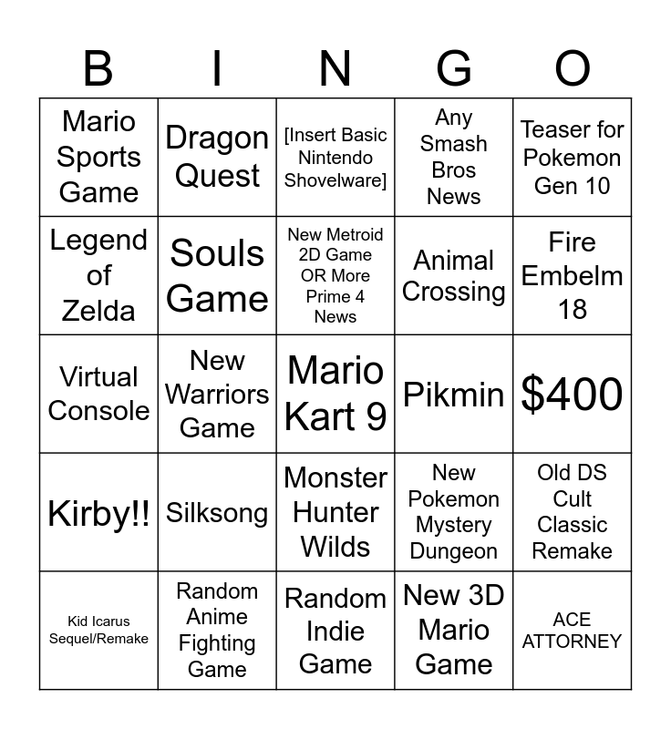 This bingo card has a free space and 24 words: Silksong, Random Anime Fighting Game, New Metroid 2D Game OR More Prime 4 News, Kid Icarus Sequel/Remake, Teaser for Pokemon Gen 10, Mario Sports Game, Legend of Zelda, Dragon Quest, Pikmin, Monster Hunter Wilds, Animal Crossing, Virtual Console, New Pokemon Mystery Dungeon, Old DS Cult Classic Remake, Souls Game, New 3D Mario Game, $400, [Insert Basic Nintendo Shovelware], Fire Embelm 18, New Warriors Game, ACE ATTORNEY, Kirby!!, Any Smash Bros News and Random Indie Game.