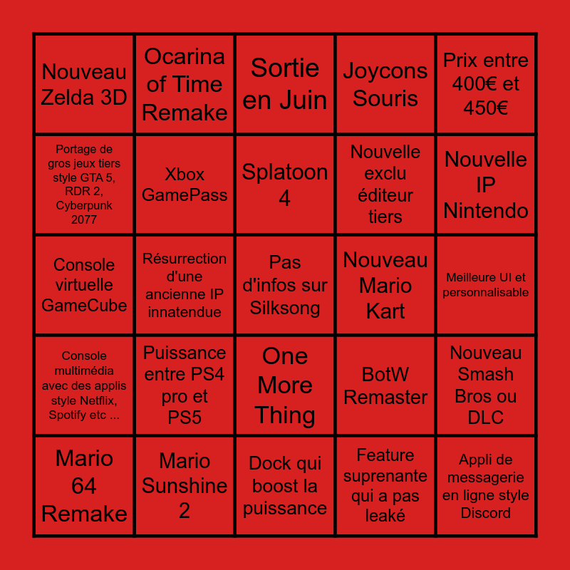 This bingo card has a free space and 24 words: Puissance entre PS4 pro et PS5, Mario Sunshine 2, Splatoon 4, Mario 64 Remake, Prix entre 400€ et 450€, Nouveau Zelda 3D, Portage de gros jeux tiers style GTA 5, RDR 2, Cyberpunk 2077, Ocarina of Time Remake, Nouveau Mario Kart, One More Thing, Nouvelle exclu éditeur tiers, Console virtuelle GameCube, BotW Remaster, Nouveau Smash Bros ou DLC, Xbox GamePass, Feature suprenante qui a pas leaké, Meilleure UI et personnalisable, Sortie en Juin, Nouvelle IP Nintendo, Résurrection d'une ancienne IP innatendue, Appli de messagerie en ligne style Discord, Console multimédia avec des applis style Netflix, Spotify etc ..., Joycons Souris and Dock qui boost la puissance.